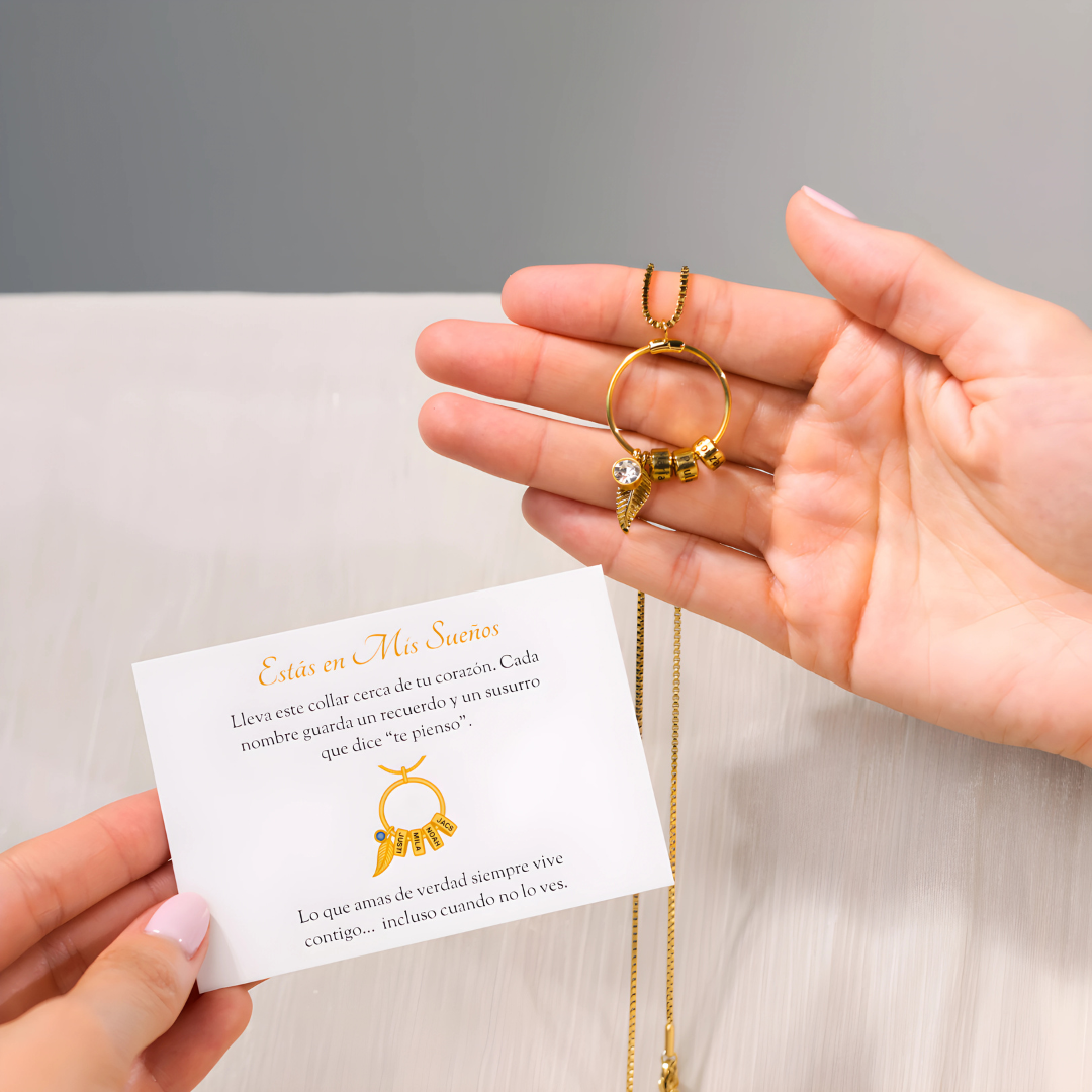 Lleva este collar cerca de tu corazón. Cada nombre guarda un recuerdo y un susurro que dice “te pienso”.