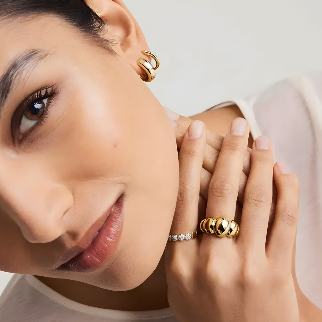 El Anillo Aura destaca por su diseño voluminoso y sofisticado, reflejando luz y carácter en cada ángulo. Su forma suave y armoniosa lo convierte en una pieza versátil, perfecta para complementar cualquier estilo con un toque de elegancia moderna.
